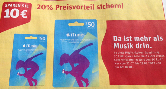Auch in dieser Woche gibt es wieder gute Nachrichten für alle Schnäppchenjäger, denn es gibt wieder mal vergünstigte iTunes-Geschenkkarten. So sind es die Supermarktketten REWE und Toom (nicht der Baumarkt), die die Karten in dieser Woche zum Sonderpreis verkaufen. Dort erhält man aktuell einen Rabatt von 20% auf die iTunes- und AppStore-Karten mit einem aufgedruckten Wert von € 50,-, zahlt also im Endeffekt an der Kasse lediglich € 40,-. Aber Achtung: Die Aktion gilt nur bis Samstag, den 27. Juli 2013, bzw. solange der Vorrat reicht. Die Anzahl der Karten pro Kauf ist anscheinend nicht begrenzt. Man sollte also im Zweifel schnell sein, um noch rechtzeitig zuschlagen zu können. Schließlich haben die Karten ja kein Verfallsdatum. Der aufgedruckte Wert der Karten kann sowohl für Musik, als auch für Fernsehserien, Filme und Einkäufe im Mac- und iOS-AppStore genutzt werden. (mit Dank an Uwe, Maik, Peter und Christoph!)