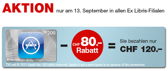 Nachdem ich am Montag bereits auf aktuelle Angebote von iTunes-Geschenkkarten in Deutschland hingewiesen hatte, hier noch ein Nachtrag für alle Leser in der Schweiz. Auch dort gibt es nämlich gute Nachrichten für alle Schnäppchenjäger. So bieten die Filialen der Supermarkt-Kette Spar/Eurospar die Karten aktuell zum Sonderpreis an. Auf alle iTunes-Geschenkkarten gibt es einen Nachlass von 20%. Aber Achtung: Die Aktion gilt nur bis Samstag, den 14. September 2013, bzw. solange der Vorrat reicht. Ebenfalls mit einer Aktion am Start ist der Buchhändler Exlibris. Hier erhält man beim Kauf einer AppStore-Karte mit einem aufgedruckten Wert von CHF 200,- einen satten Nachlass von CHF 80,-. Aber Achtung: Die Aktionen gilt nur am Freitag, den 13. September 2013. Die Anzahl der Karten pro Kauf ist offenbar nicht begrenzt. Man sollte