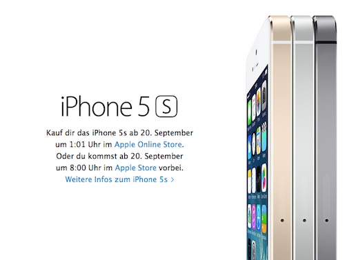 Seit heute Morgen um 09:00 Uhr lässt sich im Apple Store oder bei verschiedenen Mobilfunkanbietern (so bei der Telekom, bei Vodafone und O2) das iPhone 5c vorbestellt werden. Aktuell gestaltet sich die Liefersituation offenbar einigermaßen entspannt, der große Ansturm auf das Gerät ist offenbar ausgeblieben. Somit stehen die Chancen gut, dass die Besteller ihr Gerät am kommenden Freitag auf dem Postwege zugestellt bekommen. Auf eine Vorbestellphase verzichtet hat Apple hingegen beim iPhone 5s, welches aber ebenfalls am 20. September in den Verkauf geht. An jenem Tag kann es dann entweder im Apple Online Store mit den entsprechenden Lieferzeiten bestellt oder in einem Retail Store direkt erworben werden. Per E-Mail hat Apple inzwischen entsprechende Uhrzeiten kommuniziert. Demnach lässt sich das iPhone 5s am 20. September im Apple Online Store ab 01:01 Uhr deutscher Zeit bestellen. Die Apple Retail Stores öffnen ihre Pforten an jenem Tag um 08:00 Uhr für den iPhone 5s-Verkauf.