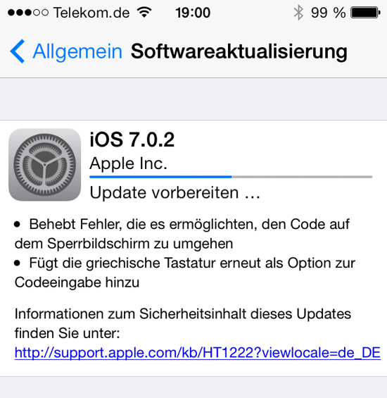 Gut eine Woche nach der Freigabe von iOS 7 hat Apple vor wenigen Minuten das erste Update für sämtliche Geräte veröffentlicht und diese damit auf die einheitliche Version 7.0.2 gebracht. Besonders wortreich gibt man sich in den Releasenotes nicht, was darauf hindeutet, dass es sich um ein kurzfristig eingeschobenes Sicherheits-Update handelt. Diesen Schluss legt auch der Inhalt der Releasnotes nahe, wo es heißt: "Behebt Fehler, die es ermöglichten, den Code auf dem Sperrbiuldschirm zu umgehen." Neben der Behebung dieser Sicherheitslücke kehrt zudem die griechische Tastatur als Option für die Codeeingabe zurück. Das Update kann OTA (Over the air) geladen werden und wiegt auf dem iPhone 5s gerade einmal knappe 20 MB.