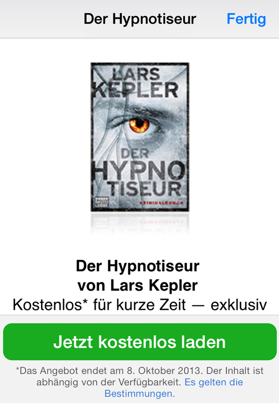 (€ 0,99 im AppStore). Nun steht das neue Angebot bereit, bei dem Apple erstmals in Deutschland ein Buch aus dem iBookstore verschenkt. Hierbei handelt es sich um den Roman "Der Hypnotiseur" von Lars Kepler. Das Buch kann ab sofort aus der Apple Store App (kostenlos im AppStore) heraus kostenlos geladen werden. Man findet es im Bereich "Empfohlen" unter dem Eintrag "Ein Buch für dich". (mit Dank an Christian!)