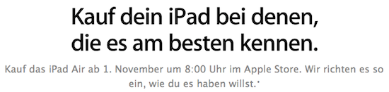 Die guten, alten Zeiten der Vorbestellphasen für neue Apple-Produkte scheinen (vorerst) vorbei zu sein. Nach dem iPhone 5s wird es auch beim iPad Air einen solchen Zeitraum nicht geben. Folglich gibt es zwei Möglichkeiten an das neue Gerät zu gelangen. Die eine läuft über den Apple Online Store und bedeutet, dass man nach dem Absetzen der Bestellung am 01. November noch eine kleine Wartezeit einkalkulieren muss, ehe das Gerät dann von Apple ausgewähltem Lieferdienst an die Haustür gebracht wird. Die andere läuft über Apples Retail Stores, die an jenem Tag vermutlich wieder von zahlreichen Apple-Fans aus aller Welt belagert werden dürften, um das Gerät direkt zum Verkaufsstart in den Händen halten zu können. Wie auch schon beim iPhone 5s wird Apple seine Ladengeschäfte an jenem Tag bereits um 08:00 Uhr öffnen.