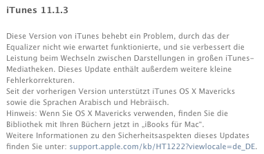 Einiges los heute Abend. Apple hat vor wenigen Minuten ein Update für iTunes veröffentlicht. Version 11.1.3 kümmert sich laut Releasnotes dabei hauptsächlich um Fehlerkorrekturen. So behebt das Update ein Problem, durch das der Euqalizer nicht mehr funktionieren konnte und verbessert die Performance in größeren iTunes-Mediatheken. Ich persönlich hatte in den vergangenen Tagen vermehrt mit Abstürzen von iTunes zu kämpfen und hoffe inständig, dass das nun veröffentlichte Update auch hier für Abhilfe sorgt. Das Update kann wie gewohnt über den Update-Bereich im Mac AppStore oder iTunes selbst geladen werden. In Kürze sollen zudem weitere Updates für Mail, Safari, Remote Desktop und iBooks unter OS X Mavericks erscheinen. Auch OS 10.9.1 dürfte nicht mehr lange auf sich warten lassen.