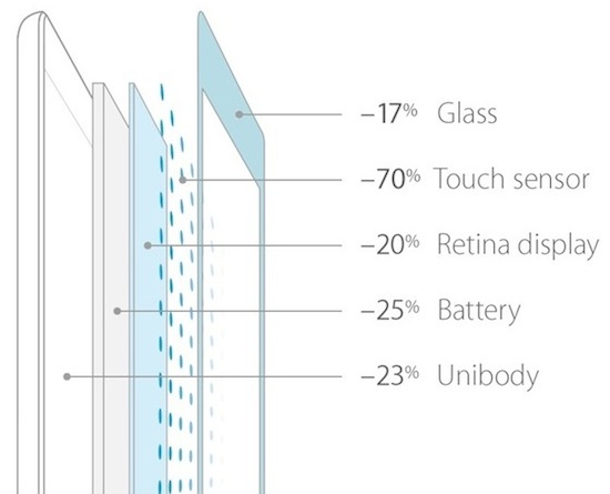 Auch ansonsten schlägt sich das Display des iPad Air gegnüber den Vorgänger-Generationen ausnehmend gut. Gegenüber dem iPad 4 wurde die Reflexion um 23% reduziert, sowie die maximale Helligkeit um 7% und der Kontrast um 32% erhöht. Insgesamt war das Display ganz offensichtlich der Schlüssel für die Verringerung von Masse und Maßen beim iPad Air. So konnte Apple durch den geringeren Energieverbrauch den Akku deutlich verkleinern. Unter anderem verwendet das iPad Air nur noch 36 LEDs zur Beleuchtung des Displays. Bei den Vorgängergenerationen waren dies bis zu 84 Stück. All dies hat dazu geführt, dass der Akku nun um 25% geschrumpft ist. Und das bei gleich gebliebener Laufzeit. (via MacRumors)