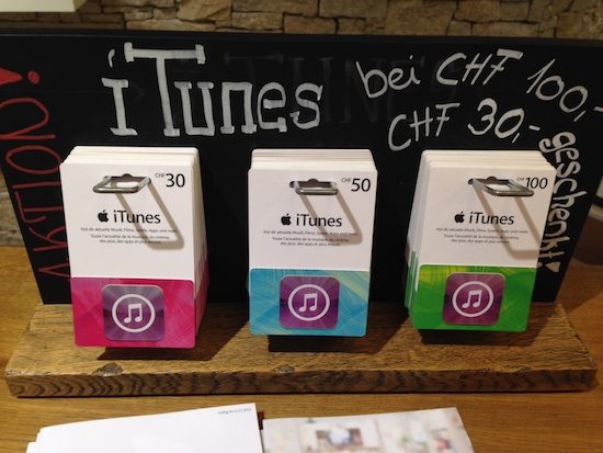 Derzeit gibt es nicht allzu häufig Schnäppchen-Angebote für iTunes-Geschenkkarten. In Österreich und der Schweiz lässt sich in dieser Woche allerdings wieder Geld sparen. So ist es in Österreich mal wieder Libro, wo man vergünstigte iTunes-Geschenkkarten abstauben kann. Hier erhält man aktuell einen Rabatt von 15% auf alle iTunes- und AppStore-Karten. Aber Achtung: Die Aktion gilt nur bis Samstag, den 16. November 2013 bzw. solange der Vorrat reicht. In der Schweiz erhält man aktuell in den Swisscom-Shops zu jeder gekauften Karte im Wert von CHF 100,- eine weitere Karte im Wert von CHF 30,- gratis dazu. Die Anzahl der Karten pro Kunde und Einkauf ist offenbar bei beiden Angeboten nicht begrenzt. Man sollte also im Zweifel schnell sein, um noch rechtzeitig zuschlagen zu können. Schließlich haben die Karten ja kein Verfallsdatum. Der aufgedruckte Wert der Karten kann sowohl für Musik, als auch für Fernsehserien, Filme und Einkäufe im Mac- und iOS-AppStore genutzt werden. (mit Dank an David!)