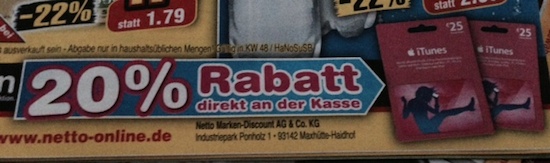 vergünstigte iTunes-Geschenkkarten. So sind es dieses Mal die Filialen der Supermarktketten Netto und Penny, die die Karten zum Sonderpreis verkaufen. Hier bekommt man in dieser Woche 20% Rabatt auf alle iTunes- und AppStore-Karten mit einem aufgedruckten Wert von € 25,-, zahlt also nur € 20,-. Aber Achtung: Die Aktionen gelten nur bis Samstag, den 30. November 2013 bzw. solange der Vorrat reicht. Die Anzahl der Karten pro Kunde und Einkauf ist offenbar nicht begrenzt. Man sollte also im Zweifel schnell sein, um noch rechtzeitig zuschlagen zu können. Schließlich haben die Karten ja kein Verfallsdatum. Der aufgedruckte Wert der Karten kann sowohl für Musik, als auch für Fernsehserien, Filme und Einkäufe im Mac- und iOS-AppStore genutzt werden. (mit Dank an Peter und Daniel!)