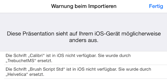 Man kennt das Problem. Da hat man sich eine schöne Präsentation mit Keynote oder PowerPoint am Rechner erstellt und sie dann auf das iPad geladen, um sie von dort aus dann einem geneigten Publikum zu präsentieren. Dabei hat man sich die tollsten Gedanken gemacht, welche Schriftart auf welcher Folie zum Einsatz kommen soll, um das Publikum bei Laune zu halten. Voller Vorfreude startet man die Präsentation und muss leider feststellen, dass sie unter Umständen gar nicht mehr so aussieht, wie sie es noch am Rechner tat. Der Grund hierfür ist, dass unter iOS leider nicht alle Schriftarten verfügbar sind, die man vielleicht auf seinem Rechner hat. Die Konsequenz ist letztlich, dass Keynote auf dem iPad dies mit der unten zu sehenden Meldung quittiert und die nicht verfügbaren Schriftarten ersetzt. Speziell für Unternehmen mit besonderen Schriftarten in ihrem Corperate Design ist dies ein Graus. Als Abhilfe kann man sich entweder auf iOS Fonts schlau machen, welche Schriftarten auf den iOS-Geräten verfügbar sind und diese dann verwenden oder aber man installiert sich die gewünschten Schriftarten einfach nach. Seit iOS 7 (in früheren Versionen leider nicht) ist dies nämlich tatsächlich möglich, wenn auch über einen kleinen Umweg. Die folgende Anleitung zeigt Schritt für Schritt, wie man dies bewerkstelligen kann.