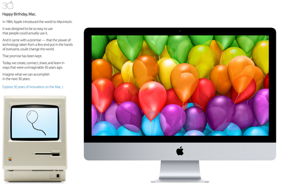Ja, man kann es nicht leugnen, der heutige Tag steht voll und ganz im Zeichen des 30. Geburtstags des Mac. Und sogar Cupertino, eigentlich nicht für sentimentale Rückblicke bekannt, feiert das Jubiläum kräftig. Nachdem sich bereits verschiedene hochrangige Apple-Manager in Interviews zu Wort gemeldet haben, wurde im Laufe des Tages auch die Startseite des Unternehmens ganz in das Zeichen des Macs gesetzt. Dort findet man aktuell ein Bild des ersten Macintoshs neben seinem aktuellen Bruder. Allein dieser Vergleich ist schon spannend anzusehen. Daneben findet man auch noch eine Grußbotschaft an das Wahrzeichen des Unternehmens: "Happy Birthday, Mac.In 1984, Apple introduced the world to Macintosh. It was designed to be so easy to use that people could actually use it. And it came with a promise -- that the power of technology taken from a few and put in the hands of everyone, could change the world. That promise has been kept. Today, we create, connect, share, and share, and learn in ways that were unimaginable 30 years ago. Imagine what we can accomplish in the next 30 years."