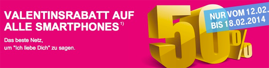Wer aktuell noch Bedarf an einem neuen Smartphone hat, sollte einmal bei der Telekom vorbeischauen. Dort werden ab heute und noch bis zum 18. Februar 50% Rabatt auf den Gerätepreis sämtlicher Smartphones gewährt, sofern man dort als Neukunden einen neuen Vertrag abschließt. Das iPhone 5s mit 16 GB Speicherkapazität bekommt man so beispielsweise im Tarif Complete Comfort S für € 199,98 (statt € 399,95). Der Vertrag schlägt noch einmal mit monatlich € 28,95 zu Buche. Entscheidet man sich für den monatlich € 42,45 teuren Complete Comfort M, kostet das Gerät € 149,98 statt € 299,95 und im Complete Comfort L sind es € 49,98 statt € 99,95 bei monatlichen Kosten von € 60,45. Wahlweise kann man sich aber auch für ein iPhone 5c oder ein Gerät eines anderen Herstellers, wie Samsung, Sony oder HT entscheiden. Die Aktion mit dem Namen "Valentinsrabatt" läuft noch bis zum 18. Februar und kann über einen Klick auf den folgenden Banner erreicht werden.
