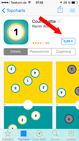 Wirklich problematisch wird es allerdings dann, wenn die App im Store als gratis angezeigt wird, im Hintergrund aber schon ein anderer Preis hinterlegt ist. In diesem Fall würde der hinterlegte Betrag dem Kunden nämlich in Rechnung gestellt, obwohl er in dem Glauben gehandelt hat, eine kostenlose App zu laden. Mein Leser Christian hatte in den verganenen Wochen und Monaten bereits mehrfach dieses Problem, welches er mir auch sehr schön anhand der beiden unten zu sehenden Screenshots zeigen konnte. Während die App in der Liste als "Gratis" angezeigt wird, wird sie in der Detailansicht bereits mit einem Preis von € 0,89 geführt. In diesem Fall war es purer Zufall, dass Christian nicht auf den Kaufen-Button gedrückt hat, sondern so verrutscht war, dass er in die Detail-Ansicht gelangt und dort den tatsächlichen Preis angezeigt bekam. Seinen Schilderungen zufolge kann man sich kaum hiergegen wehren. Während Apple ein paar Mal aus Kulanz den (falsch angezeigten) Kaufpreis zurückerstattete, hatte dies irgendwann ein Ende. Nichts desto trotz sollte jeder iTunes- bzw. AppStore-Kunde wohl besser die per E-Mail zugestellten Rechnungen aus dem iTunes-Store im Auge behalten und im Schadenfall bei Apple Alarm schlagen. Bleibt zu hoffen, dass Apple dieses Problem möglichst schnell in den Griff bekommt.