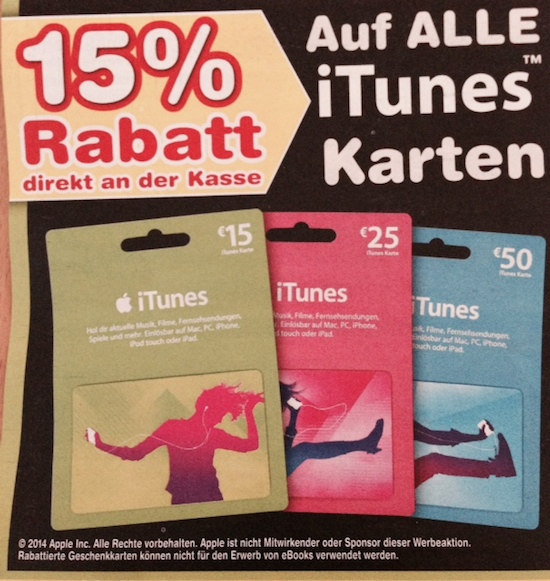 Achtung: Leider kann ich die Hinweise auf die günstigen iTunes-Karten nicht in jedem einzelnen Fall überprüfen. Checkt daher bitte vorher noch einmal ab, ob die jeweilige Filliale den Rabatt auch tatsächlich gewährt!