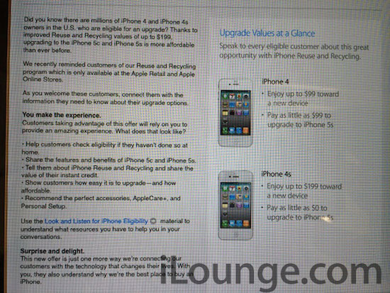 Eben jene "Details" sehen so aus, dass Apple bis zu 99,- US$ für ein zurückgegebenes iPhone 4 und bis zu 199,- US$ für ein iPhone 4s zahlt. Auf diese Weise könnte man je nach abgeschlossenem Vertrag bereits ein iPhone 5s für 0,- US$ erhalten, wie aus den Unterlagen für Retail-Mitarbeiter hervorgeht: