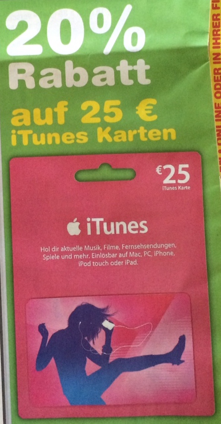 Achtung: Leider kann ich die Hinweise auf die günstigen iTunes-Karten nicht in jedem einzelnen Fall überprüfen. Checkt daher bitte vorher noch einmal ab, ob die jeweilige Filliale den Rabatt auch tatsächlich gewährt!
