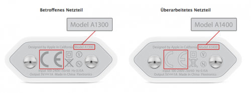 Gestern leider aus Zeitgründen ein wenig untergegangen, greife ich heute gerne die zahlreichen eingegangenen Hinweise zu einem wichtigen Thema mit Dank an alle Tippgeber noch einmal auf. Apple hat gestern bekannt gegeben, dass es in Europa eine Rückrufaktion für Netzteile geben wird, die zwischen Oktober 2009 und September 2012 gemeinsam mit dem iPhone 3GS, iPhone 4 und iPhone 4S ausgeliefert wurden. Demnach kann es passieren, dass die 5 Watt USB-Netzteile "in seltenen Fällen" überhitzen und somit ein potenzielles Sicherheitsrisiko darstellen. Betroffen sind die unten abgebildeten Netzteile mit der Modellnummer A1300, nicht betroffen hingegen die mit der A1400. Ist man betroffen, kann der Austausch entweder in einem Apple Store oder bei einem autorisierten Apple Service Provider vorgenommen werden. Weitere Informationen liefert Apple auf einer entsprechend geschalteten Webseite. Wichtig zu erwähnen ist noch, dass das zum Netzteil gehörende iPhone beim Umtausch vorgezeigt werden muss. Hat man wegen des beschriebenen Defekts bereits in Eigenregie ein neues Netzteil gekauft, kann man sich den Kaufpreis über den Apple Support rückerstatten lassen.