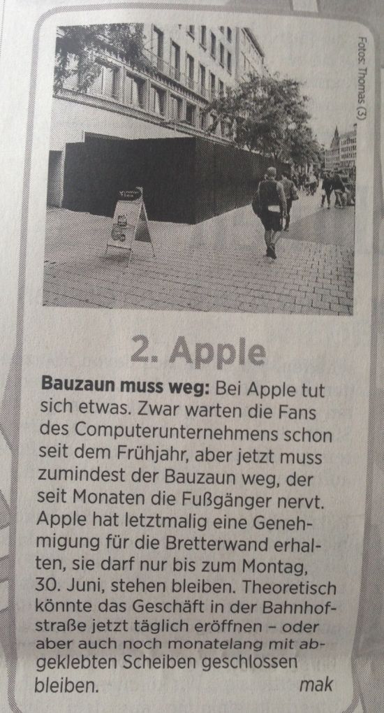 Die Baustelle für den Apple Store in der hannöverschen Bahnhofstraße kann inzwischen gut und gerne mit dem in der Bundeshauptstadt (nein, ich meine nicht den BER) verglichen werden. Zumindest was die Dauer des Umbaus betrifft. Während gerüchtehalber Mängel an der Bausubstanz, sowie ein größerer Schimmelbefall die Eröffnung des 14. deutschen Apple Stores immer wieder verzögerten, scheint nun ein Licht am Ende des Tunnels zu erscheinen, welches ziemlich schnell näher kommt. Einem Bericht der Hannoverschen Allgemeinen zufolge wurde nämlich die Genehmigung für den schwarzen Bauzaun vor dem Gebäude letztmalig bis zum 30. Juni verlängert. Dies könnte gut und gerne auf eine Eröffnung des Stores Ende Juni oder Anfang Juli hindeuten. Ein Foto der Kollegen von iFun, welches einen Blick hinter den schwarzen Bauzaun wirft, macht auf jeden Fall Hoffnung auf eine baldige Eröffnung. Die Fassade ist fertig, den Apple-Schildern muss nur noch die Verkleidung entrissen und der Fahnenmast an den Gewindestangen befestigt werden, dann kann es eigentlich los gehen. (mit Dank an Rico für das Foto des Zeitungsausschnitts!)