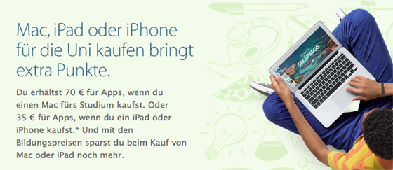 Auch in diesem Jahr bietet Apple wieder seine seit Jahren bekannte "Back to School" Promotion an. Dies hatte sich bereits heute Morgen angedeutet, als sich der Apple Store über mehrere Stunden in den Offline-Modus verabschiedete. Nach seiner Rückkehr war dann auch die neue Aktion mit an Bord. Dabei ändert Apple gegenüber dem vergangenen Jahr erwartungsgemäß nicht die bekannten Spielregeln. Erwirbt man als qualifizierter Kunde aus dem Bildungsbereich (dies umfasst Schüler, Student, Eltern von Schülern, Lehrer, Mitarbeiter von Bildungseinrichtungen) einen neuen, qualifizierten Mac, erhält man dazu einen Gutschein in Höhe von € 70,- für den AppStore, Mac AppStore, iTunes Store oder iBookstore. Kauft man hingegen ein iPad oder ein iPhone, gibt es immerhin noch einen Gutschein in Höhe von € 35,-. Die Ausnahme bei den Macs bildet wie auch schon in den vergangenen Jahren der Mac mini, zu dem es keine Gutscheinkarte dazu gibt. Alle Informationen gibt es auf der Sonderseite im Apple Store: Back to School