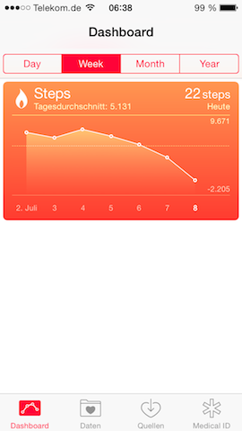 Die Neuerungen und Änderungen an der gestern veröffentlichten dritten Beta von iOS 8 fielen eher moderat aus. Angesichts der vorherigen Instabilität der Beta dürfte sich jedoch ohnehin jeder Entwickler hauptsächlich darüber freuen, dass Apple offensichtlich einen Großteil der Fehler ausgemerzt hat, die einem vorher auf den Keks gingen. Eine wirkliche Neuerung betrifft jedoch die Health-App. Diese kann man nun erstmals auch ohne das Vorhandensein eines Fitness-Gadgets in Aktion sehen. Möglich wird dies durch die Nutzung des M7-Chips im iPhone 5s, der die App nun mit Daten versorgt. Konkret geht es dabei um gezählte Schritte, die nun über einen Zeitraum von sieben Tagen in die Vergangenheit in Health dargestellt werden können (hierfür ist eventuell ein Neustart des Geräts notwendig). Ebenfalls neu ist eine Sektion zur Überwachung des täglichen Koffein-Konsums, die sich künfitg unter anderem mit der App UP Coffee (kostenlos im AppStore) von Jawbone verstehen könnte, eine App, die es ermöglich, die Menge an Kaffee, Tee und anderen koffeinhaltigen Getränken aufzuzeichnen.