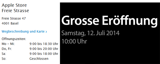 Bereits vor einigen Tagen deutete sich an, dass Apple demnächst in der Freien Straße in Basel seinen vierten Retail Store in der Schweiz eröffnen wurde. Nun steht auch das genaue Datum für die Eröffnung fest. Sowohl auf den Schweizer Retail-Webseiten, als auch in der Basler Zeitung (mit Dank an Steffi!) wird auf die "große Eröffnung" am kommenden Samstag, den 12. Juli um 10:00 Uhr hingewiesen. Traditionell verteilt Apple auch in Basel kostenlose T-Shirts an die ersten 1.000 Besucher. Auch der eine oder andere deutsche Apple-User dürfte sich über diese Nachricht freuen, ist es doch beispielsweise von Freiburg gerade einmal eine halbe Stunde Autofahrt zum neuen Apple Store im Nachbarland.