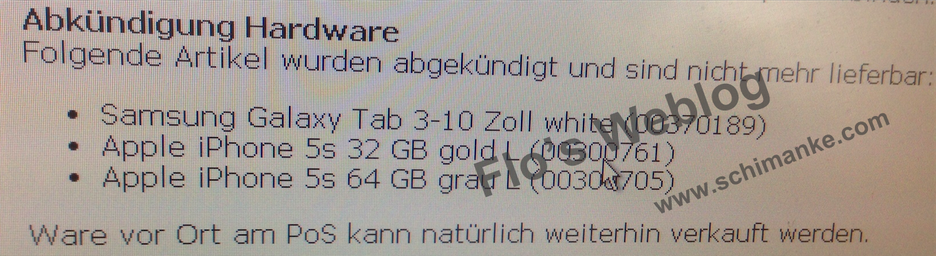 Erst im vergangenen Jahr brachte Apple das iPhone 5s auf den Markt. Zeitgleich erschien zudem das iPhone 5s, was zeitgleich das Ende des damals gerade einmal einem Jahr alten iPhone 5 bedeutete. Lediglich das iPhone 4s überlebte neben den beiden neuen Generationen. Ein ähnliches Spiel könnte sich nun auch in diesem Jahr wiederholen. Zumindest, dann wenn man dem deutschen Mobilfunkanbieter Vodafone Glauben schenkt. Dieser informierte nämlich bereits seine Shops, dass das iPhone 5s bereits abgekündigt wurde und nicht mehr lieferbar sei. Hiermit lag der Anbieter auch im vergangenen Jahr beim iPhone 5 bereits (teilweise) richtig. Aktuell ist zwar nur von der 32 GB und der 64 GB Version in Gold die Rede, dies kann jedoch auch noch weitere Modelle betreffen. Gut möglich, dass dann die erwartete 4,7"- und die 5,5"-Variante des iPhone 6 die Rollen übernehmen, die im vergangenen Jahr iPhone 5s und iPhone 5c gespielt haben. Endgültige Gewissheit werden wir dann am kommenden Dienstag nach dem heiß erwarteten Event haben. (mit Dank an Martin!)
