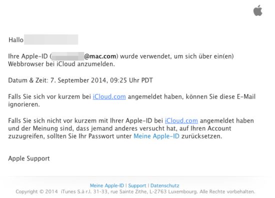 Die aus iCloud-Accounts abgegriffenen privaten Bilder diverser Prominenter bestimmten in der vergangenen Woche weite Teile der Boulevardpresse und der einschlägigen Apple-Newsseiten. Zwar war Apple redlich bemüht, die Schuld von sich zu weisen und stattdessen die Verantwortung für sichere Passwörter (zu Recht) an den Nutzer weiterzureichen, allerdings hatte Tim Cook auch zusätzliche Sicherheitsmaßnahmen für iCloud angekündigt. Die erste Stufe hat Cupertino dabei offenbar bereits gezündet. Verschiedene Webseiten berichten heute, dass Apple inzwischen damit begonnen hat, E-Mail-Benachrichtigungen an den Besitzer des iCloud-Accounts zu versenden, wenn sich jemand von einem Browser aus auf dem jeweiligen iCloud-Account angemeldet hat. Bislang war dies immer nur dann der Fall, wenn man sein Apple-ID Kennwort geändert, neue Zahlungsdaten hinterlegt, oder erstmals von einem neuen Gerät Einkäufe im iTunes- oder AppStore getätigt hat. (via iPhone-Ticker)
