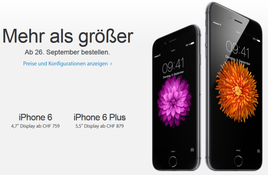 Als Apple am gestrigen Abend das iPhone 6 in seinen beiden Varianten präsentierte, gab man an, dass das Gerät ab dem 12. September vorbestellbar sei und ab dem 19. September in den Verkauf gehen würde. Dies ist allerdings nur die halbe Wahrheit, denn sie betrifft lediglich die Märkte in Deutschland, USA, Australien, Kanada, Frankreich, Großbritannien, Hong Kong, Japan, Puerto Rico und Singapur. Unsere Nachbarn in Österreich und der Schweiz müssen sich daher ein wenig länger gedulden. Inzwischen ist auch klar, wie lange genau. So gibt Apple inzwischen an, dass die beiden iPhone 6 in diesen Ländern ab dem 26. September bestellt werden können. Die österreichischen Preise entsprechen denen in Deutschland, in der Schweiz kostet das iPhone 6 mit 16 GB CHF 759,-, mit 64 GB CHF 879,- und mit 128 GB CHF 999,-. Für das iPhone 6 Plus werden bei 16 GB CHF 879,- fällig, bei 64 GB CHF 999,- und bei 128 GB CHF 1.119,-. Alternativ bietet sich natürlich am 19. September ein kleiner Abstecher zu uns an. Die Apple Stores in München, Augsburg und Sindelfingen sollten noch mit vertretbarem Aufwand zu erreichen sein.