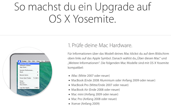 Noch steht OS X Yosemite nicht im Mac AppStore zum Download zur Verfügung. Bis es soweit ist, lohnt eventuell noch ein Blick auf die von Apple veröffentlichten Upgrade-Informationen. Hier findet man alle Infos zu allgemein unterstützter Hardware und auch dazu, welche Funktionen auf welcher Hardware verfügbar sind. Während sich OS X Yosemite grundsätzlich auf verschiedenen Geräten ab dem Jahr 2007 installieren lässt, werden beispielsweise sowohl Handoff und Instant Hotspot, als auch AirDrop zwischen einem Mac und einem iOS-Gerät erst ab dem Baujahr 2012 unterstützt. Als Installationsvoraussetzung für OS X Yosemite wird mindestens OS X in der Version 10.6.8 vorausgesetzt. Ein Blick auf die Informationen kann also in jedem Fall nicht schaden.