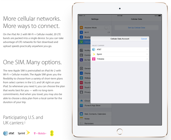 The new Apple SIM is preinstalled on iPad Air 2 with Wi-Fi + Cellular models. The Apple SIM gives you the flexibility to choose from a variety of short-term plans from select carriers in the U.S. and UK right on your iPad. So whenever you need it, you can choose the plan that works best for you — with no long-term commitments. And when you travel, you may also be able to choose a data plan from a local carrier for the duration of your trip.