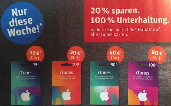 Zu Beginn der Woche gibt es wieder einmal gute Nachrichten für alle Schnäppchenjäger: Es gibt wieder vergünstigte iTunes-Geschenkkarten. Dieses Mal sind es die Filialen der Supermarktkette REWE, die die Karten zum Sonderpreis verkaufen. Hier bekommt man in dieser Woche beim Kauf einer iTunes- oder AppStore-Karte mit einem beliebigen aufgedruckten Wert einen Nachlass von 20%. Aber Achtung: Die Aktion gilt nur bis Samstag, den 07. März 2015 bzw. solange der Vorrat reicht. Die Anzahl der Karten pro Kunde und Einkauf ist anscheinend nicht begrenzt. man sollte also im Zweifel schnell sein, um noch die eine oder andere Karte abzugreifen. Der aufgedruckte Wert der Karten kann sowohl für Musik, als auch für Fernsehserien, Filme und Einkäufe im Mac- und