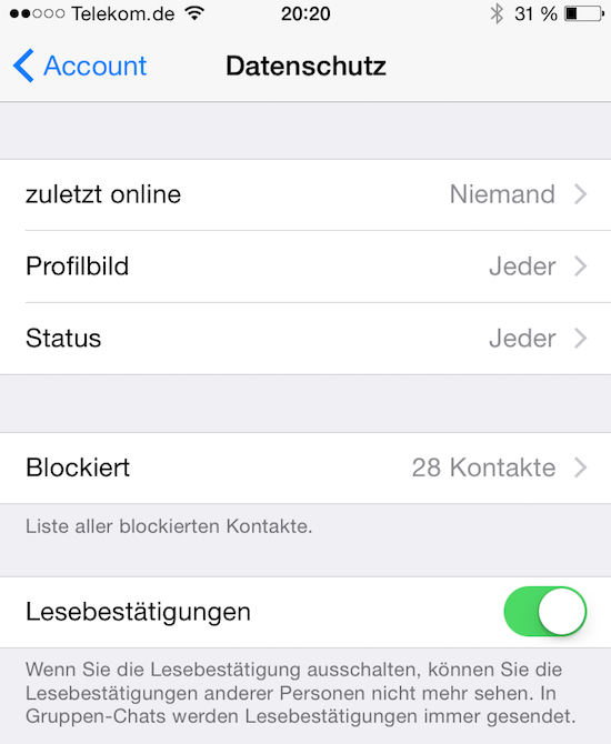 Und noch eine spannende Neuerung ist in dem Update enthalten. So lassen sich inzwischen die bei vielen Nutzern unbeliebten blauen Häkchen als Lesebestätigung wieder deaktivieren. Die entsprechende Option findet man in den Einstellungen unter "Account > Datenschutz > Lesebestätigungen".