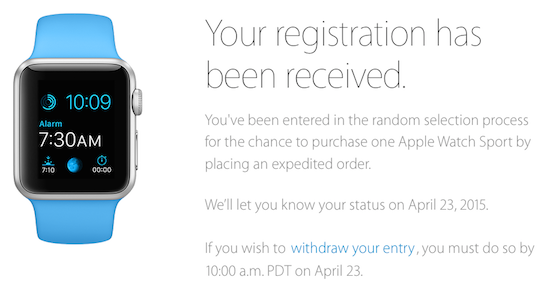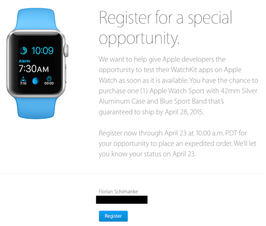 Ist man bei Apple als iOS-Entwickler registriert, lohnt sich unter Umständen aktuell ein Blick in den Posteingang. Hier könnte sich nämlich eine E-Mail von Apple befinden, in der einem die Möglichkeit angeboten wird, eine silberne 42mm Apple Watch Sport mit einem blauen Sport-Armband zu bestellen, die garantiert bis zum 28. April geliefert wird. Auf diese Weise möchte Apple seinen Entwicklern möglichst frühzeitig die Möglichkeit geben, ihre Apps auf die Apple Watch anzupassen und auf echter Hardware zu testen. In der E-Mail heißt es: "We want to help give Apple developers the opportunity to test their WatchKit apps on Apple Watch as soon as it is available. You have the chance to purchase one (1) Apple Watch Sport with 42mm Silver Aluminum Case and Blue Sport Band that’s guaranteed to ship by April 28, 2015. This opportunity is offered by random selection and quantities are limited. Register now though April 23 at 10 a.m. PDT. We’ll let you know your status on April 23."