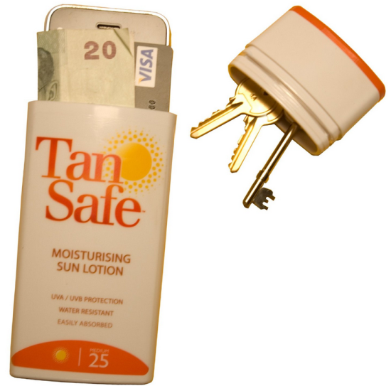 Die erste Frage stellt sich schon, wenn es an den Strand oder an den Pool geht. Soll ich mein iPhone mitnehmen oder lieber im Safe auf dem Zimmer lassen? Schließlich will man ja auch mal ins Wasser und das teure Stück nicht unbeaufsichtigt auf dem Handtuch zurücklassen. Ähnliches gilt natürlich auch für den Zimmerschlüssel und ein bisschen Kleingeld. Für diesen Fall haben sich findige Jungs den "Tan Safe" einfallen lassen - eine als Sonnencreme-Flasche getarnte Aufbewahrungslösung für jeden möglichen Kleinkram. Denn wer klaut schon eine Sonnencreme?! Freilich auch für den Selbstbau geeignet, kann der Tan Safe über den folgenden Link zum Preis von € 13,40 bei Amazon bestellt werden: Tan Safe