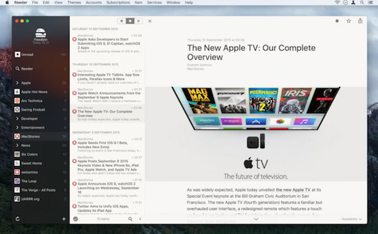 Es gibt so Apps, die halte ich einfach für Pflicht-Downloads. Hierzu zähle ich auch sowohl auf iPhone und iPad (€ 4,99 im AppStore), als auch auf dem Mac den RSS-Reader Reeder (€ 9,99 im Mac AppStore) von Silvio Rizzi. Für mich sind RSS-Feeds nach wie vor eine geniale Informationsquelle, die sich perfekt an die eigenen Interessen und Themen anpassen lässt. Passend zur Veröffentlichung von OS X El Capitan am gestrigen Abend, steht nun auch für Reeder ein Update auf Version 3 im AppStore bereit, welches unter anderem auch die Kompatibilität mit dem neuen Mac-Betriebssystem mitbringt. Optisch wirkt die App, als würde sie zum Standard-Umfang von OS X gehören, bringt darüber hinaus in der neuen Version aber auch zusätzliche Themes mit, so dass sich die Optik an den eigenen Geschmack anpassen lässt. Zudem behebt Version 3 diverse Probleme und bringt jede Menge