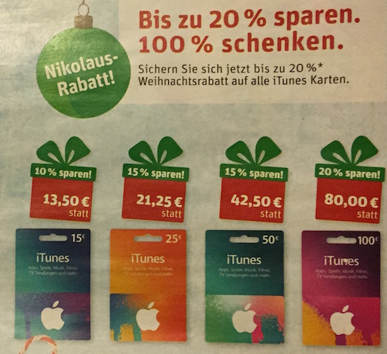 Achtung: Leider kann ich die Hinweise auf die günstigen iTunes-Karten nicht in jedem einzelnen Fall überprüfen. Checkt daher bitte vorher noch einmal ab, ob die jeweilige Filliale den Rabatt auch tatsächlich gewährt!