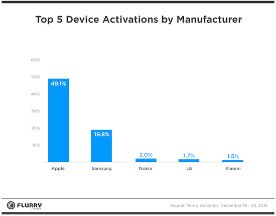 Apple selbst gibt die Zahlen für das Weihnachtsgeschäft zwar erst bei der nächsten Veröffentlichung der Quartalszahlen bekannt, dennoch zeichnet sich bereits ab, dass es auch dieses Jahr wieder äußerst erfolgreich gewesen sein dürfte. So haben die Experten von Flurry Analytics alle neuen Geräteaktivierungen von Smartphones und Tablets in der Weihnachtswoche weltweit ermittelt und ihre Erkenntnisse veröffentlicht. Demnach dominiert Apple hier auch im Jahr 2015 dominiert deutlich. So sollen knapp die Hälfte (49,1%) der Neugeräte aus Cupertino stammen. Erst mit 19,8% folgt Samsung weit abgeschlagen auf Platz 2. Alle anderen Hersteller können vernachlässigt werden, wie auch aus der unten zu sehenden Grafik hervorgeht.