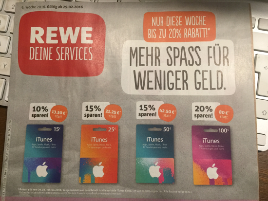 Die neue Woche beginnt mal wieder mit einem interessanten Angebot für alle Schnäppchenjäger: Es gibt wieder vergünstigte iTunes-Geschenkkarten. So sind es dieses Mal die Filialen der Supermarktkette REWE, die die Karten zum Sonderpreis verkaufen. Dort erhält man dabei einen Rabatt von 10% auf die iTunes- und AppStore-Karten im Wert von € 15,-. Bei den Karten im Wert von € 25,- und € 50,- sind es sogar 15% und bei den Karten im Wert von € 100,- sind es 20%. Aber Achtung: Die Aktion gilt nur bis Samstag, den 05. März 2016, bzw. solange der Vorrat reicht. Die Anzahl der Karten pro Kauf ist anscheinend nicht begrenzt. Man sollte also im Zweifel schnell sein, um noch rechtzeitig zuschlagen zu können. Schließlich haben die Karten ja kein Verfallsdatum. Der aufgedruckte Wert der Karten kann sowohl für Musik, als auch für Fernsehserien, Filme und Einkäufe im Mac- und iOS-AppStore genutzt werden. (mit Dank an alle Steffen!)