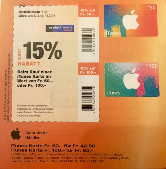 Und auch meine Leser in der Schweiz können sich über eine aktuelle iTunes-Aktion freuen. Bei unseren Nachbarn ist es Migros melectonics, wo man aktuell und noch bis zum 07. März sparen kann. Bei Vorlage des unten zu sehenden Bons erhält man dort 15% Rabatt beim Kauf einer iTunes-Karte im Wert von FR 50,- oder FR 100,-. (mit Dank an Thomas!)