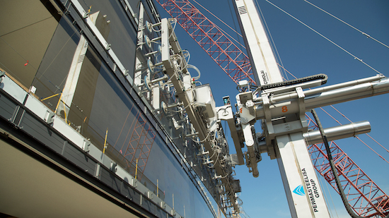 Doch auch das Hauptgebäude des Campus strotzt geradezu nur so vor Superlativen. Die Fassade besteht aus 3.000 in Deutschland gefertigten riesigen gebogenen Glaspanelen, von denen jedes 14 Meter hoch und gut 3 Meter breit ist. Um sie montieren zu können, mussten extra Maschinen gebaut werden, die Apple "Manipulators" nennt.