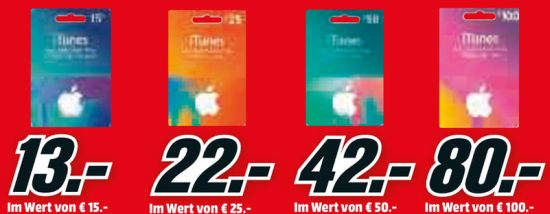 Nachdem am Montag bereits einige Supermärkte eine neue Aktion mit vergünstigten iTunes-Geschenkkarten gestartet hatten, zieht heute noch der Media Markt nach. Dort erhält man dabei unterschiedliche Rabatte auf die iTunes- und AppStore-Karten. Bei Karten im Wert von € 15,- muss man somit nur € 13,- bezahlen. Bei den Karten im Wert von € 25,- sind es € 22,- und bei den Karten im Wert von € 50,- sind es € 42,-. Am meisten spart man bei den Karten im Wert von € 100,-. Hier zahlt man lediglich € 80,-. Aber Achtung: Die Aktion gilt nur bis Dienstag, den 22. März 2016, bzw. solange der Vorrat reicht. Die Anzahl der Karten pro Kauf ist anscheinend nicht begrenzt. Man sollte also im Zweifel schnell sein, um noch rechtzeitig zuschlagen zu können. Schließlich haben die Karten ja kein Verfallsdatum. Der aufgedruckte Wert der Karten kann sowohl für Musik, als auch für Fernsehserien, Filme und Einkäufe im Mac- und iOS-AppStore genutzt werden.
