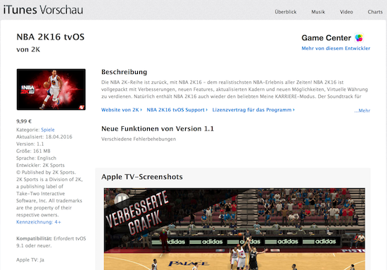Aktuell scheint das Feature allerdings noch nicht komplett implementiert zu sein, auch wenn man die Funktion bereits mit verschiedenen Apps, wie z.B. NBA 2K16 tvOS (€ 9,99 im Apple TV AppStore) testen kann. Zum jetzigen Zeitpunkt funktionieren allerdings anscheinend nur Links auf tvOS-only Apps. Apps, die als Unviersal-App für das iPhone, das iPad und das Apple TV konzipiert sind, zeigen noch keine Apple TV Inhalte im Web an. Während bei den tvOS-only Apps momentan zwar bereits Screenshots und die App-Beschreibung anzeigt, ist es zudem derzeit noch nicht möglich, die Apps über die Webseite, bzw. die gewohnte anschließende Weiterleitung in den iTunes AppStore zu erwerben.