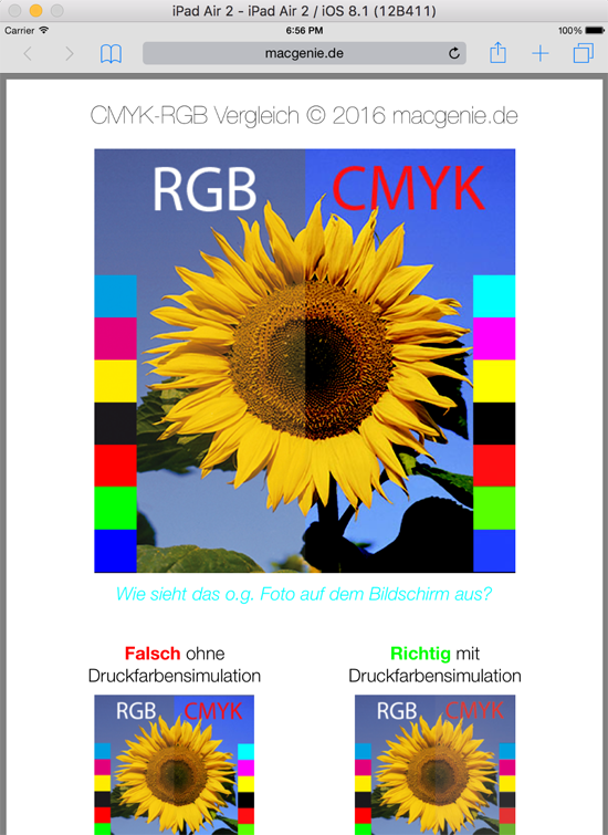 Oben: Unkorrekte CMYK-Darstellung unter iOS 8.1
