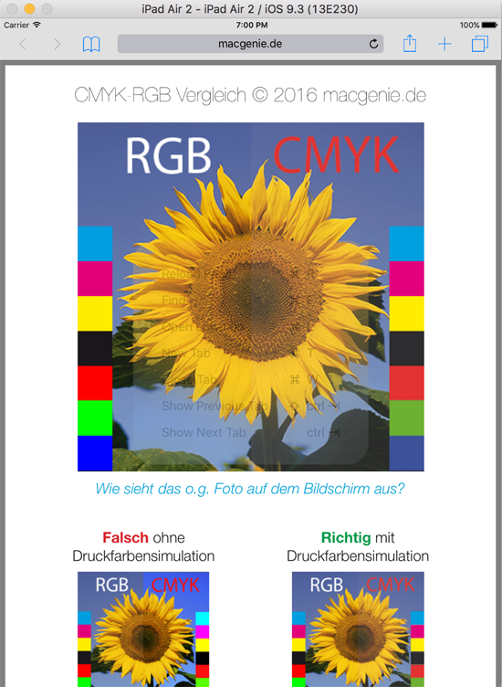 Unten: Korrekte CMYK-Darstellung unter iOS 9.3