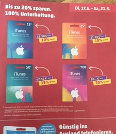Achtung: Leider kann ich die Hinweise auf die günstigen iTunes-Karten nicht in jedem einzelnen Fall überprüfen. Checkt daher bitte vorher noch einmal ab, ob die jeweilige Filliale den Rabatt auch tatsächlich gewährt!