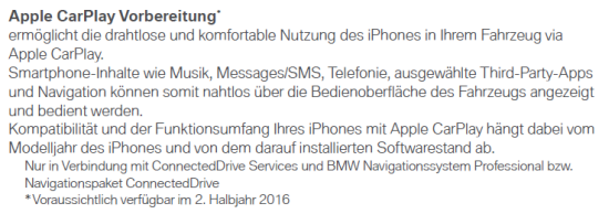 Apples Weg in das Auto seiner Nutzer schreitet weiter voran. Als einer der letzten der großen Autobauer weltweit hat nun auch BMW angekündigt, demnächst eine Unterstützung für CarPlay anzubieten. Noch in diesem Jahr soll der offiziellen Verlautbarung zufolge eine Vielzahl aktueller Modelle des bayrischen Herstellers ab Werk mit CarPlay ausgestattet sein. Wer auf diese Weise gerne sein iPhone mit seinem BMW drahtlos vernetzen möchte, wird hierfür mit € 300,- als Zusatzoption zu den Navigationspaketen Professional und ConnectedDrive zur Kasse gebeten. Der nachfolgend zu sehende Screenshot kann unter anderem der aktuellen Preisliste für den BMW X5 M und den BMW X6 M entnommen werden.