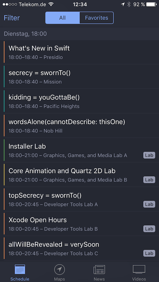 Innerhalb der App findet man natürlich den Zeitplan über die verschiedenen Veranstaltungen während der Konferenzwoche und erhält Zugriff auf die Videomitschnitte der Sessions. Interessierte können bereits einen Blick auf die angesetzten Workshops werfen, deren Überschriften derzeit noch in humorvollen Swift-Codeschnipseln gehalten sind. Die tatsächlichen Themen, die sich sehr wahrscheinlich hauptsächlich um iOS 10 und OS X 10.12 drehen werden, gibt Apple erst nach der Keynote bekannt.