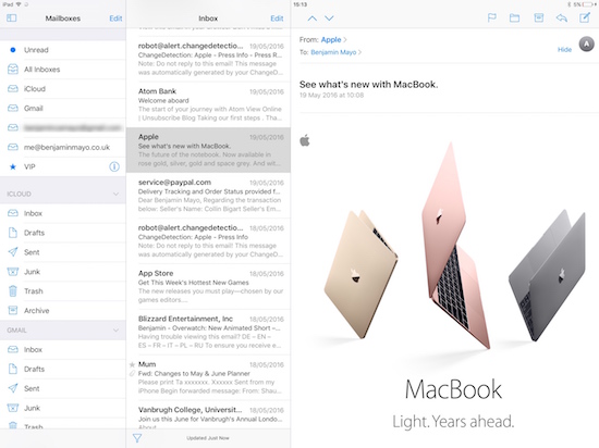 Wie zu erwarten, fördert die erste Beta von iOS 10, die sich seit Montagabend in den Händen der Entwickler befindet nach und nach immer neue kleine Verbesserungen und neue Funktionen ans Tageslicht, die vielleicht nicht immer der großen Rede wert sind, aber das mobile Betriebssystem Stück für Stück runder machen. So bringt iOS 10 beispielsweise auf dem 12,9" iPad Pro eine neue Ansicht für verschiedene Apps mit. Unter anderem Mail oder auch die Notizen-App können nun auf ein 3-spaltiges Layout zurückgreifen, welches hier und da an die Ansichten derselben Apps auf dem Mac erinnert. Wie unten zu sehen, kann so beispielsweise in Mail die linke Spalte alle Mailkonten enthalten, die mittlere Spalte dann die einzelnen Mails des ausgewählten Kontos und die linke Spalte schließlich den Mailinhalt. Praktisch!