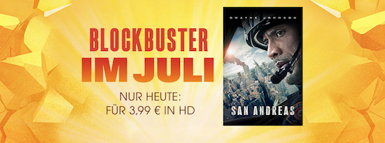Apple versüßt allen Filmfans den diesjährigen Juli mit einer besonderen Aktion im iTunes Store. Unter dem Motto "Blockbuster im Juli" wird dabei jeden Tag ein neuer Film im iTunes Store für 24 Stunden auf lediglich noch € 3,99 im Preis gesenkt. Hierfür erhält man dann die Kaufversion des Titels in HD-Qualität. Am heutigen Tag handelt es sich dabei um den Action-Film San Andreas mit Dwayne "The Rock" Johnson (€ 3,99 bei iTunes). Selbst wenn man aktuell keine Zeit hat, sich den Streifen zu Gemüte zu führen, kann ein Zuschlagen bei diesem Preis nicht schaden. Da es sich um die Kaufversion handelt, kann man den Film nach dem Kauf schauen wann man will und ihn auch jederzeit aus iCloud erneut kostenlos herunterladen. Viel Spaß!