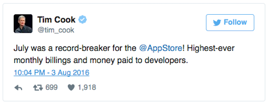 Mit zwei Tweets hat Apple CEO Tim Cook gestern Abend bekannt gegeben, dass der Juli ein absoluter Rekordmonat für den AppStore gewesen ist. In seinem ersten Tweet sagte Cook, dass der Juli 2016 der Monat war, in dem Apple bislang am meisten Umsatz im AppStore erzielte und das bislang meiste Geld innerhalb eines Monats an Entwickler ausgezahlt hat. Bereits bei der Bekanntgabe der aktuellen Quartalszahlen konnte Cook den höchsten Quartalsumsatz des AppStore bislang vermelden. Die Wachstumsrate gegenüber dem Vorjahresquartal betrug satte 27%. Innerhalb der kommenden 12 Monate erwartet Cook, dass Apples Services (AppStore, iTunes Store, Apple Music, iCloud und AppleCare) die Größe eines Fortune 100 Unternehmens erreichen werde. Für den erfolgreichen Juli war sicherlich auch das Anfang des Monats veröffentlichte Pokémon GO verantwortlich, das einen Startrekord für die meisten Downloads innerhalb der ersten Verkaufswoche gesetzt hatte, inzwischen über 100 Millionen Mal geladen wurde und über 10 Millionen US-Dollar pro Tag an Umsatz generiert.