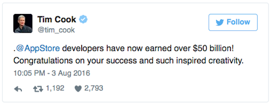 In seinem zweiten Tweet vermeldete der Apple CEO, dass sein Unternehmen seit des Bestehens des AppStore inzwischen bereits über 50 Milliarden US-Dollar an die Entwickler ausbezahlt habe. Und das gerade einmal in acht Jahren. Beeindruckend.
