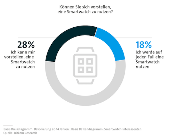 Wie dem auch sei, ein Potenzial für Smartwatches ist in jedem Fall vorhanden, wie der Branchenverband Bitkom nun im Rahmen einer repräsentativen Umfrage in der deutschen Bevölkerung ermittelt hat. Demnach planen von den 1.007 befragten, mindestens 14 Jahre alten Teilnehmern 18% künftig "auf jeden Fall" eine Smartwatch zu nutzen. Immerhin 28% können sich zudem die Nutzung einer Smartwatch zumindest vorstellen. Zusammengerechnet zeigen damit knapp die Hälfte der Teilnehmer Interesse an einer Smartwatch. Auf der anderen Seite können sich derzeit aber auch 28% (und dazu zähle auch ich) nicht vorstellen, ihre Armbanduhr gegen eine Smartwatch einzutauschen. Gründe hierfür könnten sein, dass die Bedienung der Uhren von 22% für zu kompliziert erachtet wird, 24% die Geräte aktuell zu teuer finden und 18% nicht klar ist, worin der Nutzen einer Smartwatch besteht. Als weitere persönliche Anmerkung finde ich mich derzeit in allen drei dieser Beurteilungen wieder, plus dass ich eine klassische Armbanduhr einfach schöner finde. Davon abgesehen, dürften Smartwatches in Zukunft aber weiter an Akzeptanz gewinnen, sobald eine eindeutige Richtung eingeschlagen und die aktuell noch bestehenden Probleme beseitigt sind.