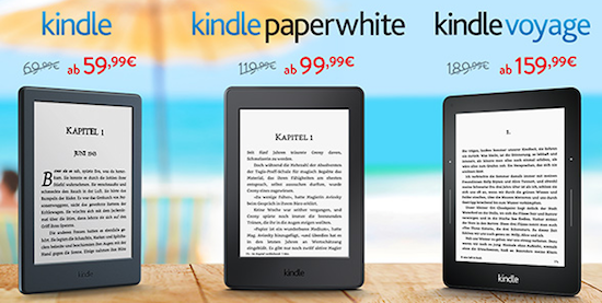 Unter dem Motto Lesesommer-Angebote bietet Amazon derzeit seine drei beliebtesten Kindle-Modelle zu vergünstigten Preisen an. Je nach regulärem Preis fallen die Rabatte dabei unterschiedlich hoch aus. So bekommt man das Einstiegsmodell Kindle aktuell zum Preis von € 59,99 statt normalerweise € 69,99. Der äußerst empfehlenswerte Kindle Paperwhite kann aktuell für € 99,99 statt normalerweise € 119,99 erworben werden und der Kindle Voyage kostet derzeit nur € 159,99 statt regulär € 189,99.